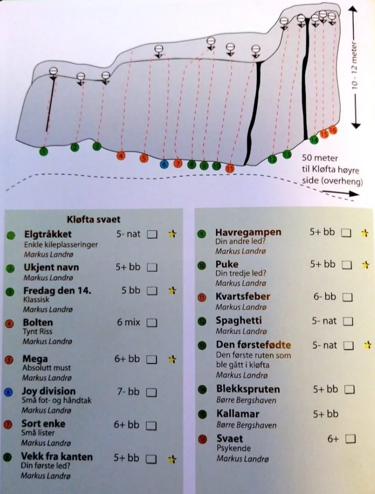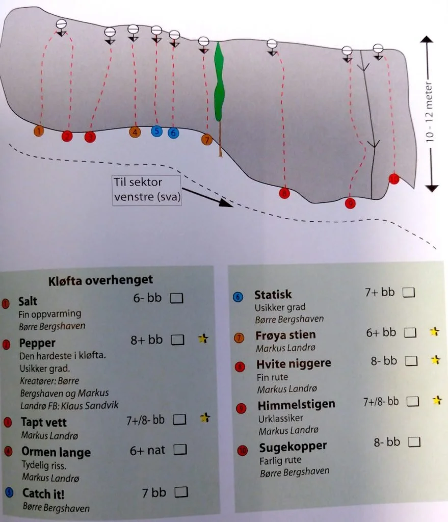 OPPDATERING SOMMER 2021: Flere ruter i Kløfta er rebolta de siste par åra, senest Pepper (8+) som er den hardeste ruta på feltet. Det gjenstår fortsatt noen ruter som bør reboltes. Det anbefales å ikke klatre på åpenbart gamle og usikre bolter.