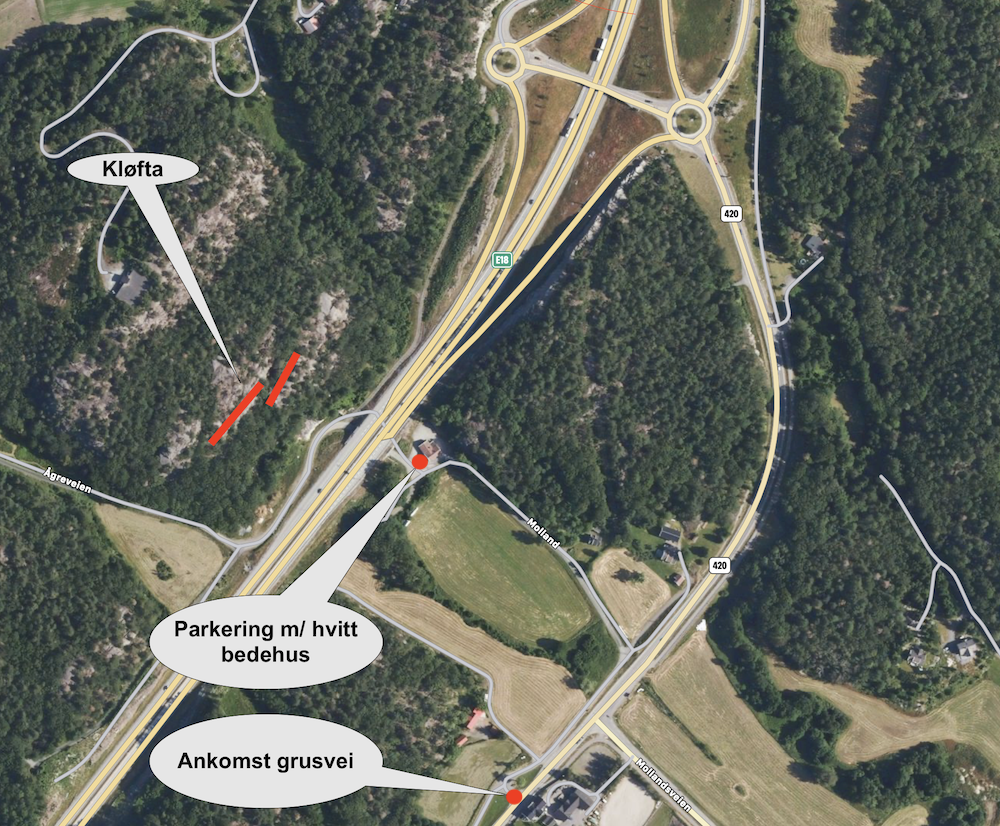 Fra Arendal på E18. Ta av E18 på første avkjørsel etter avgjørelsen til Mc Donalds. Fortsett på Rv 420 ca. 500-800 meter i sørgående retning. Følg grusvei ca 300 meter og parker med hvitt bedehus. NB. ikke kjør helt frem til feltet.