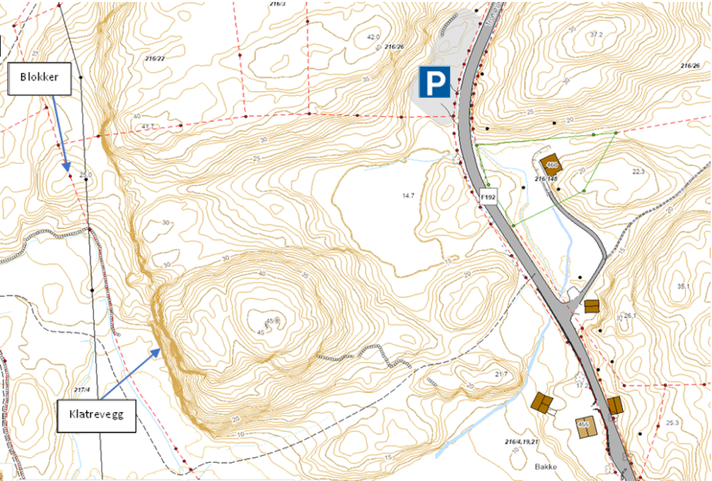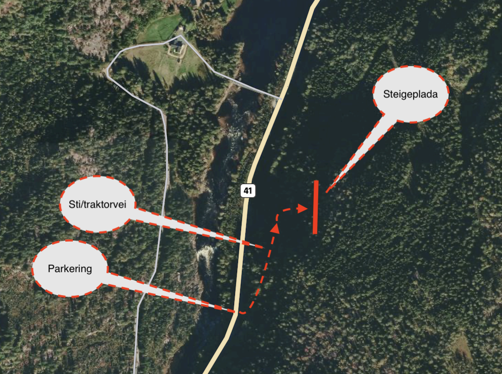 Parker på lommen i svingen før feltet som vist på kart. Gå ca. 100 meter langs veien og ta til høyre inn på tydelig traktorvei. Følg traktor veien ca. 100 meter og hold høyre inn på en sti langs fjellet og du kommer rett til de første rutene.