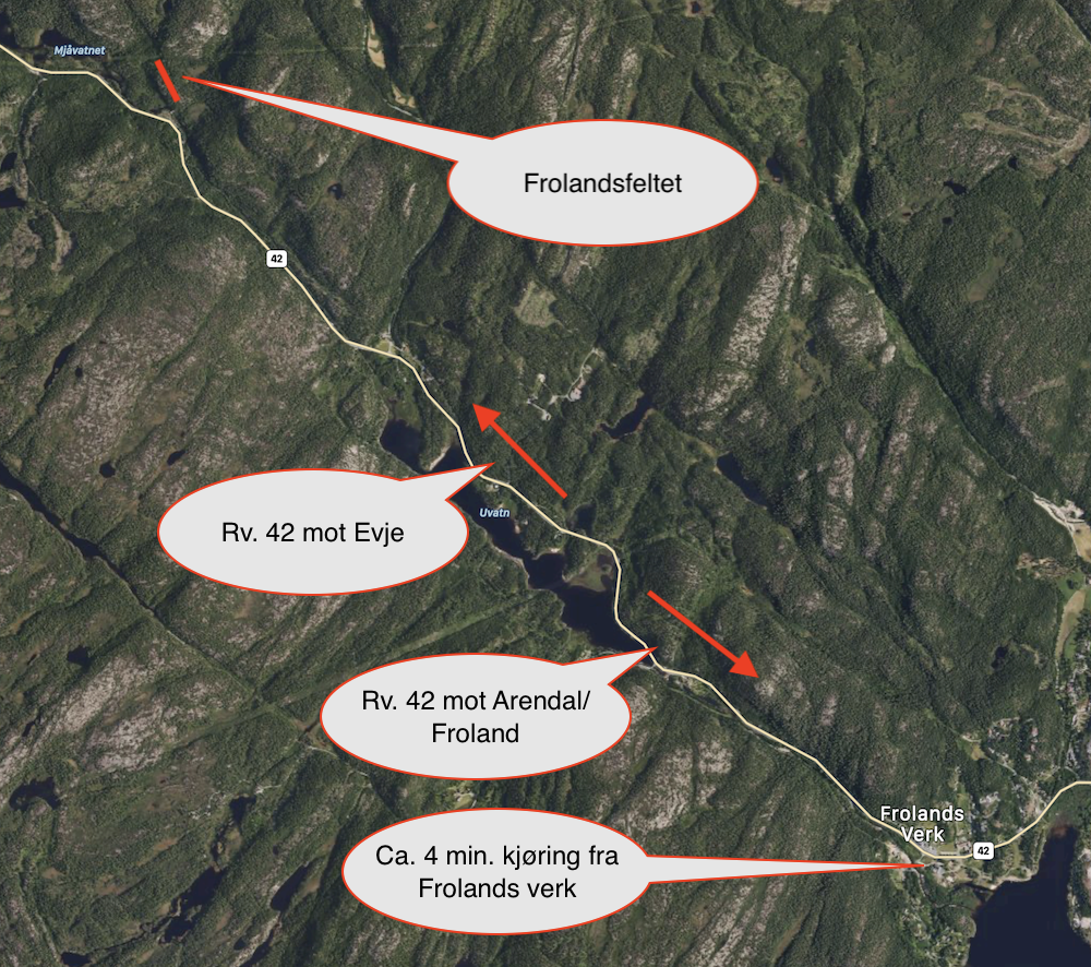 Fra Arendal/E18, kjør riksvei 42 mot Evje og Froland. Feltet ligger 9,4 km fra Froland sentrum i retning Evje. Ta av til høyre på liten stikkvei, feltet er godt synlig fra veien men kommer brått på i en liten venstresving. NB: pass på når du forlater feltet, bilene kommer fort i Froland:)