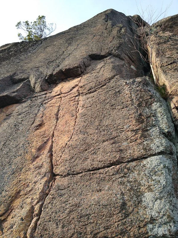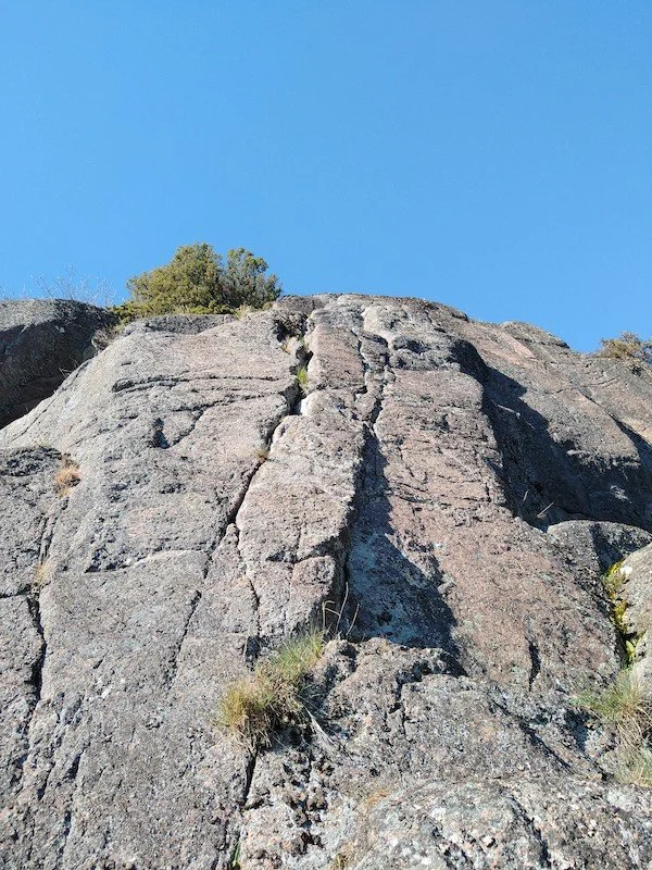 Åpenbar linje midt på veggen opp sprekka. Fjell på toppen har noen større blokker som er klemt relativt godt fast, klatre allikevel forsiktig de siste meterne. Har mistet brorparten av et tak på cruxet, litt vanskeligere nå.Groundhog’s Day – trad – 7- / 6b+ – FA Matthew Jones