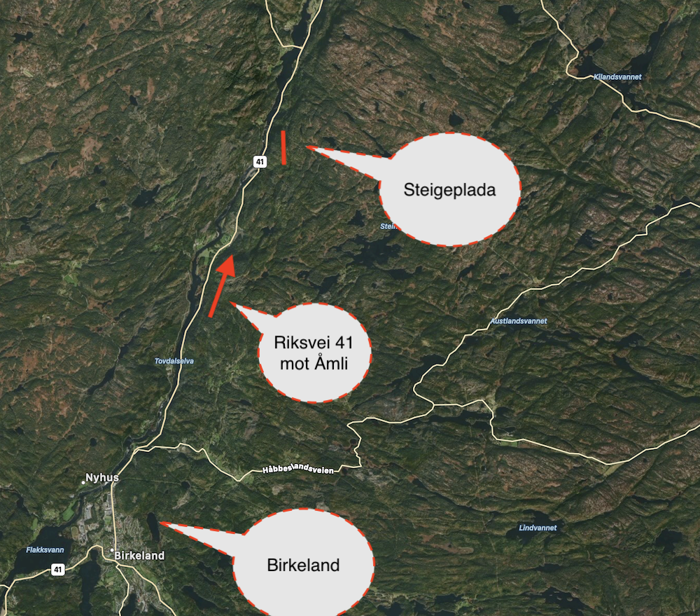 Steigeplada ligger ca 3,5 km nord for Birkeland rett ved riksvei 41. Fra Lillesand kjøre du mot Birkeland, fortsett deretter ca 3,5 km på riksvei 41 mot Åmli. Feltet er synlig på høyre side av veien. Parker på en liten lomme til høyre etter å ha passert et lite hus. Følg sti/traktor vei som går parallelt med rv. 41 men med stigning opp mot skråningen. Ca. 6 minutters anmarsj.