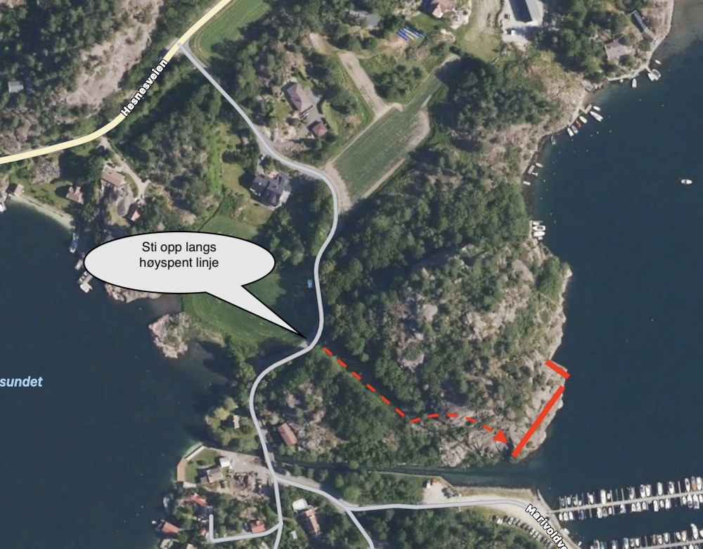 Lett å komme til med båt. Fra land følger du høyspent linje for deretter å ankomme toppen av fjellet. Mulighet for rapell ned? Det er også mulighet å klyve langs klippene og kanskje få seg et ufrivillig bad:)