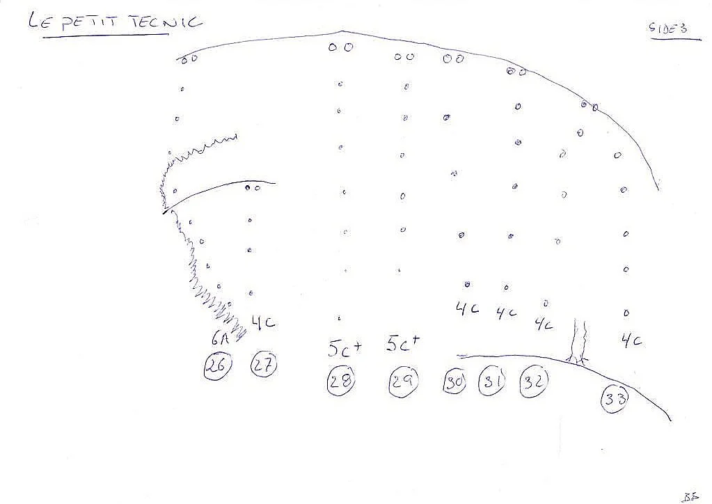 Rett opp også knekker mot høyre langs tynt riss. Tynn og teknisk klatring, enkelt plasser uten tak, dessverre.To Defy – 7 / 6c – FA Matthew Jones