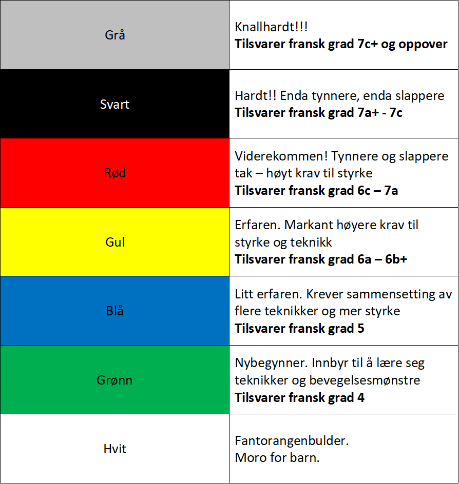 I Europa, og Norge, brukes for det meste Fontainebleau-skala, eller bare “Font“. I uniten har de selvfølgelig sitt eget system; V-skala. Font-skalaen går fra omtrent 3 til (foreløpig) 9A. Opp til og med grad 5 brukes kun tall. Fra og med grad 6 og oppover benyttes også bokstavene A-C og pluss-tegn (+), dvs. at du innenfor 6-tallet finner hele 6 ulike grader; 6A, 6A+, 6B, 6B+, 6C og 6C+. På klatresentre er gjerne fontgradene slått sammen og forenkla til er fargesystem. I Sør Amfi er fargekodinga som vist i figuren til høyre (det burde vært store bokstaver, eks. 7A og ikke 7a).