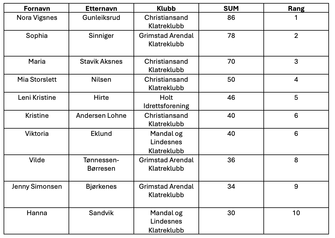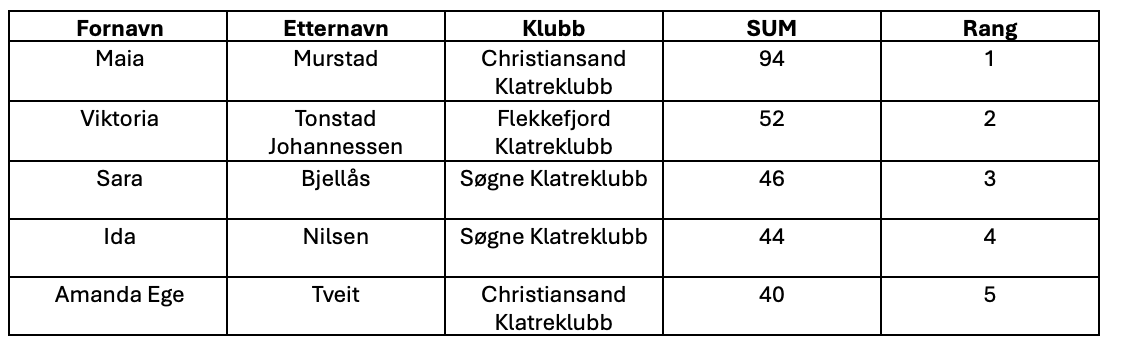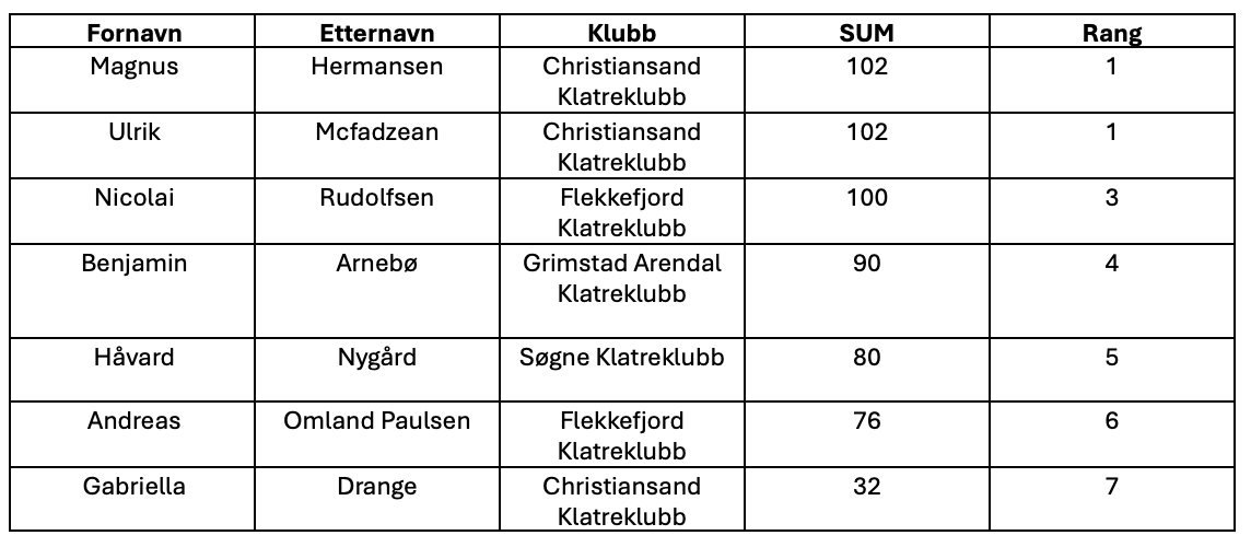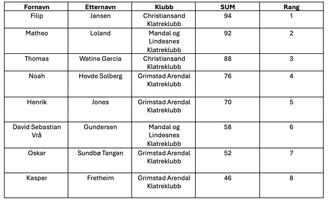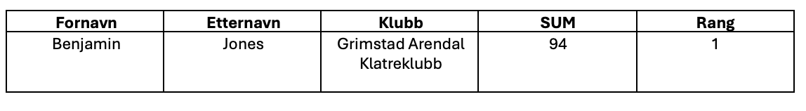 Det ble gjort en liten regnefeil før premieutdelingen i klasse Gutter B hvor 1. og 2. plass ble byttet om. Se riktig poengsum og rangering under. Gratulerer til Filip Jansen fra CKK med seieren i denne klassen!